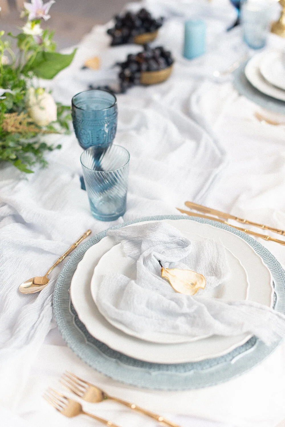 Softly draped chiffon and muslins add a delicate touch to this table setting. The gold accents in the cutlery, centrepieces and even the gold tones of the pear slices add warmth and interest and the pops of dark blue with the berries and bold blue with the glassware create a fresh, modern element. It’s all layered so beautifully by Thetwohummingbirds styling, the result is truly stunning!